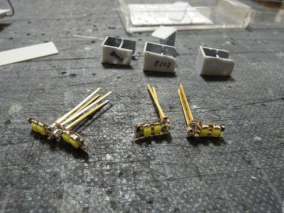パンタ台組立 ・中間車の8502用パンタ台。こちらも同様に一部配管止めを 半田付けしています。 |