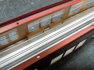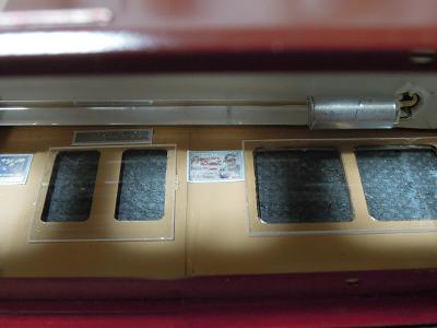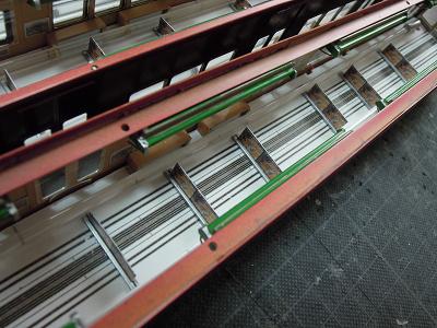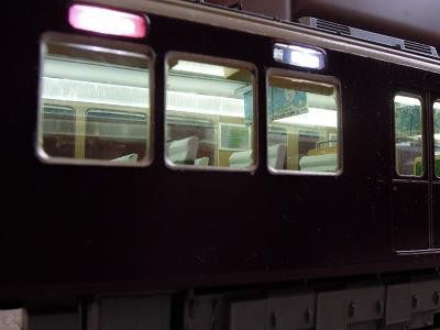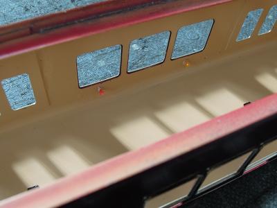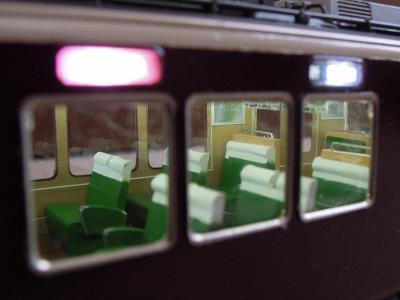 室内灯組込み ・導光材を2本通すことで、蛍光灯のような効果を 狙いました。 天井の冷風吹出口やラインデリアの表現がお判り頂ける でしょうか? まぁ大きな問題もなさそうですので、残りの車輌にも施して いきます。 |