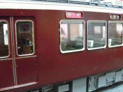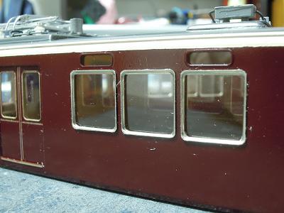 窓枠取付け。 ・阪急電車の最大の特徴となるアルミサッシ窓枠。 付属のパーツをゴム系接着剤で接着します。 このパーツ、阪急のサッシ形状(特に取っ手あたり)を 的確に捉えられた素晴らしいパーツと思います。 |