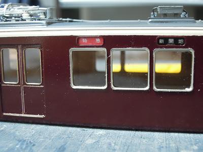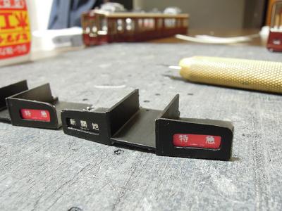 方向幕製作 ・前面も同様に透明プラ板に貼付けた方向幕シートを 車内側から貼付けています。 |