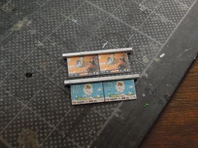 室内灯ユニット(吊り広告)の製作 ・広告のシートをプラ角材で挟んだ状態。 このあと実車の配置を参考に、天井に貼り付けて いきます。 |