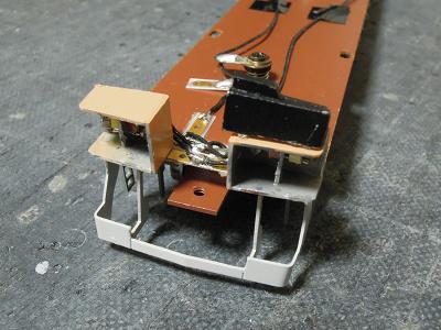 先頭車ライトユニットの組込み ・車体に実装した図。 標識等・尾藤のライトユニットはこの時点で車体側に 接着していますが、接触不良に悩まされた為、後で 床板側に移設しました。 |