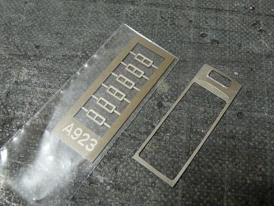車番貼付け ・最後の工程として、車番を貼り付けます。 マッハのエッチングナンバーを一つ一つゴム系接着剤で 貼り付けていきます。 本当はラッカーなどで接着する方がよいのかもしれ ませんが、はみ出しの心配があるので、ゴム系を使用 しています。 |
