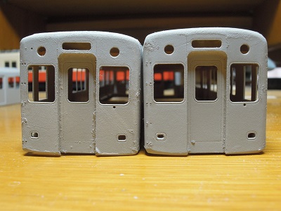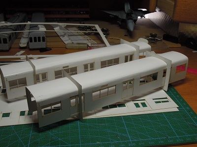 | ・車体組立(2018/9/2) 前面と妻面を各々表紙、裏紙を貼り合せます。 真ん中は平行作業中の7801形の前面です。 |