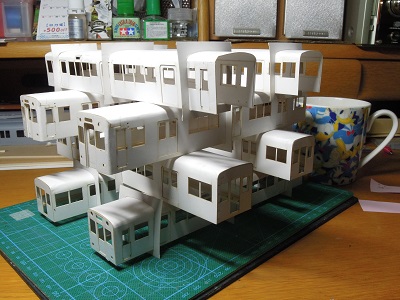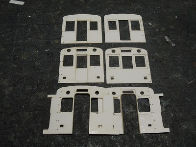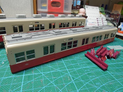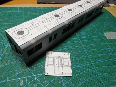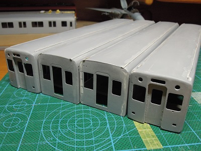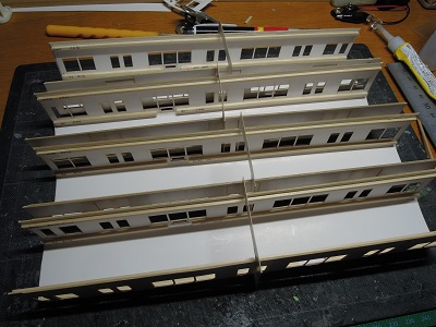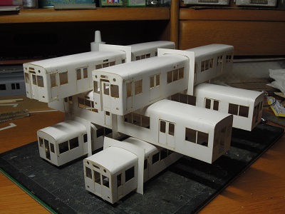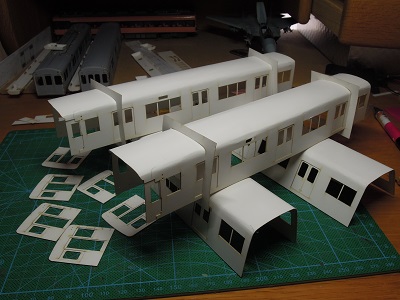 | ・車体組立(2018/9/2) まずは中間車から。 車体パーツを切り出し、表板と裏板を貼り合わせて、屋根、肩R をつけていきます。 |