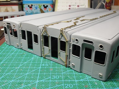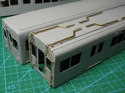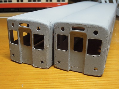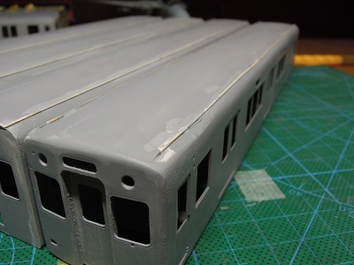 | ・車体組立(2018/9/22) 雨樋の接着は、薄く溶いたサフェを流しています。 雨樋の他、客ドアの靴ヅリなでも接着し、全体に仕上げとして #1000のサフェを吹きます。 |