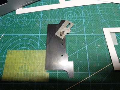 | ・車体組立(2018/9/4) 前面の組立です。 7101形では、貫通幌は埋め込み式で一段奥まっている 構造を再現するため、貫通路開口部に沿って帯材を 貼付けます。 |