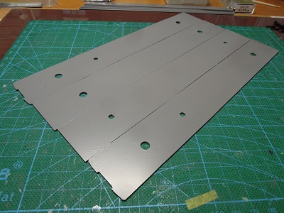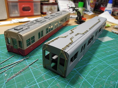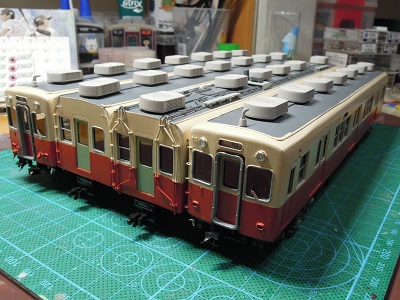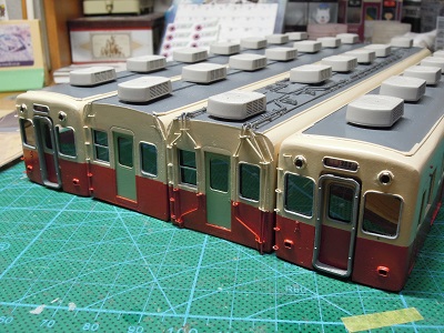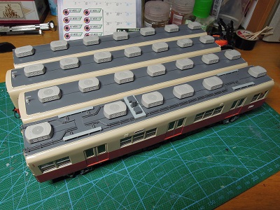 | ・車体組立(2019/11/18) 屋根グレーを吹いた状態。 クーラー台座はt=2mm、ラインデリアカバーはt=0.5mmの プラ板を貼りつけています。 |