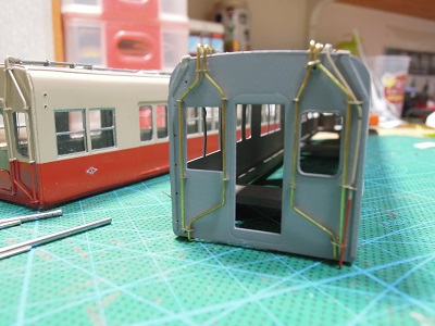 | ・車体塗装(2019/12/25) 前照灯・方向幕ユニット実装。 また室内灯の導光材の保持パーツを、プラ板で設けています。 |