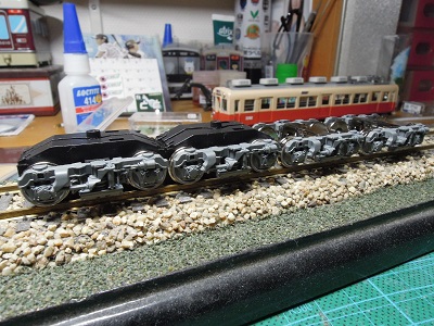 | ・車体組立(2019/12/7) 台車は、今回の新製分から日光さんのFS-329をベースに、 外側のブレーキシューを切り落としモノとしますが、リベンジ 車両は資金難もあり、前作の台車(TR-55)をそのまま代用 します。 |
