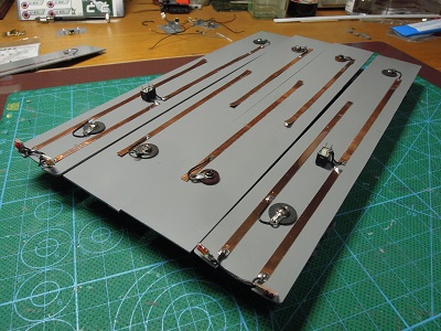 | ・車体塗装(2019/12/7) 照明対応で床下に導電材を貼り付けます。 両先頭共に他の編成7801形を併結することを前提に、照明のON/OFF スイッチを設けました。 |