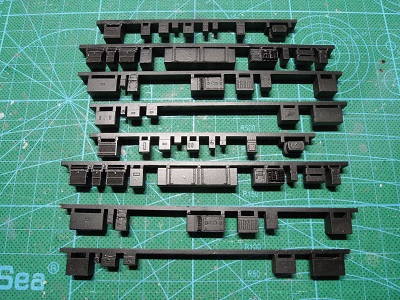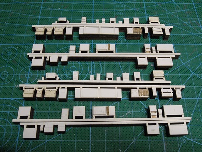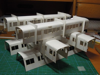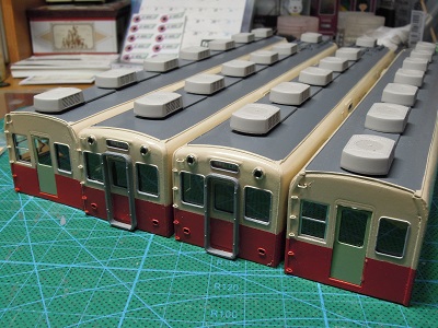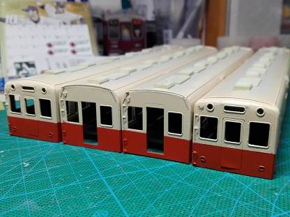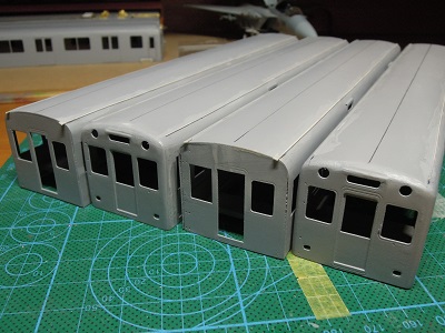 | ・車体組立(2018/9/2) 車体パーツを切り出し、表板と裏板を貼り合わせて、屋根、 肩Rをつけていきます。 付属のテンプレートを使用し、Rの具合を確認してきます。 同時進行の7105編成と合わせて作業中。 今回の車両は上の2両です。 |