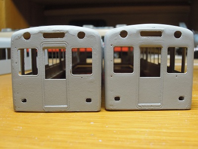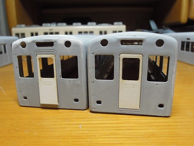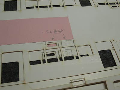 | ・車体組立(2018/9/2) 当初分けて頂いた車両は、側面方向幕位置がエラーという ことで修正版を頂いていたのですが、勿体ないので方向幕 位置の変更を行い、組立てます。 |