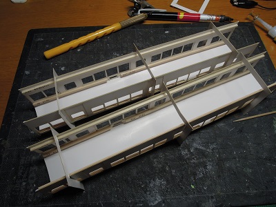 | ・車体組立(2018/9/9) 前面と妻面を貼り付けて箱状にした後、前面の成形を 行います。 |