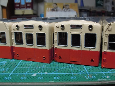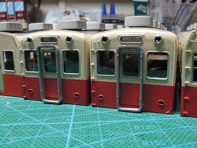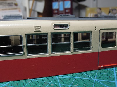 | ・車体組立(2019/11/18) 方向幕と、客ドアのゴム、戸袋窓のHゴムにもグレーを入れて います。 |