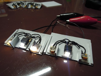 | ・車体塗装(2019/12/16) 各種ライトユニットを車体に実装していきます。 前照灯・方向幕ユニット実装。 床板からの集電端子は小型スプリングを使用しています。 また室内灯は夕庵式で、室内灯の導光材の保持パーツを、 プラ板で設けています。 |