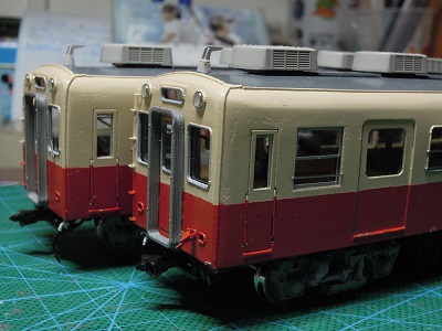 | ・車体組立(2019/10/8) 雨樋の接着は、薄く溶いたサフェを流しています。 雨樋の他、客ドアの靴ヅリなでも接着し、全体に仕上げとして #1000のサフェを吹きます。 2023/7/16 |