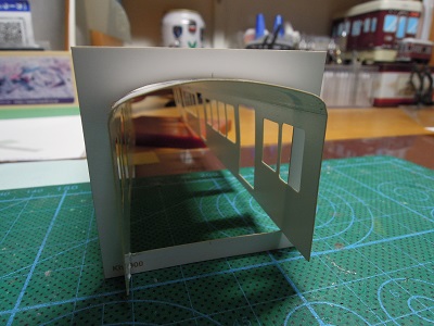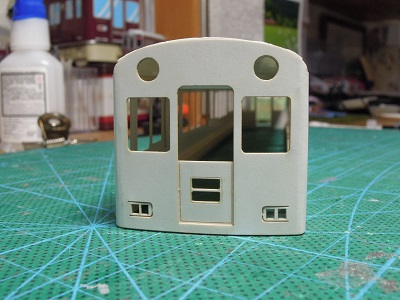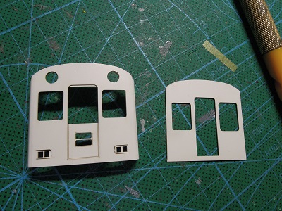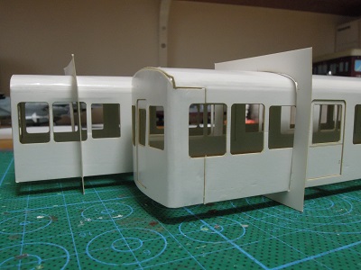 | 1913車体組 ・顔の状態ですが、更新車の貫通ドアは面一のようです ので、1段凹んだ貫通ドア部にドアを接着するつもりです。 しかし、上部に糊代が無いことに気付き、後から型紙の 余白を用いて、上半分の抜きが狭くなるように、手直し しました。 |