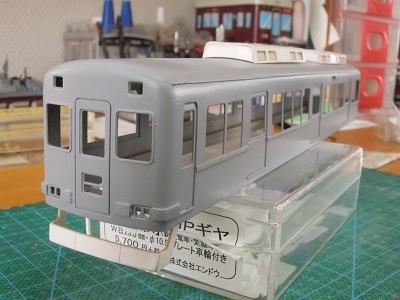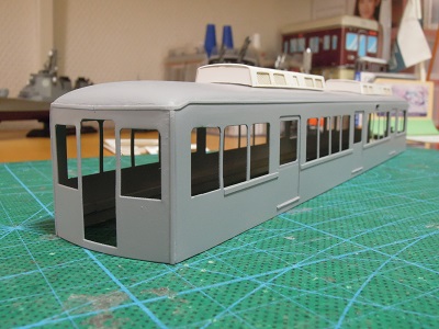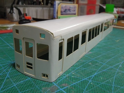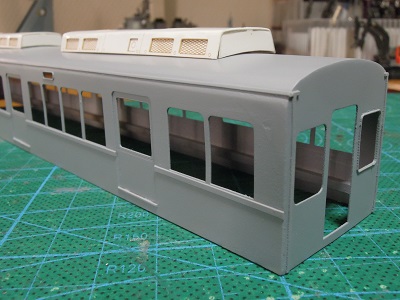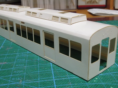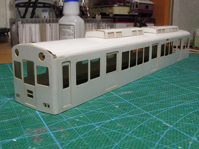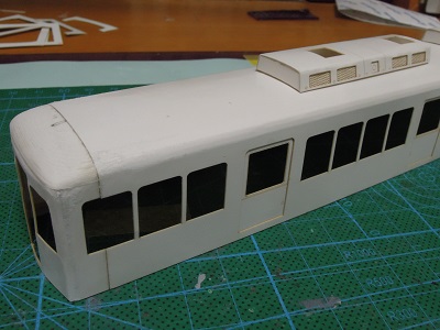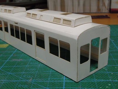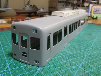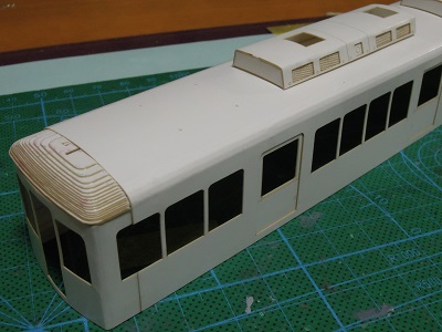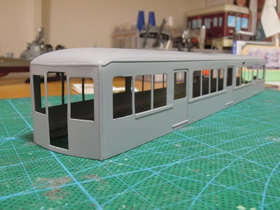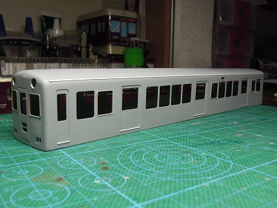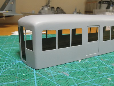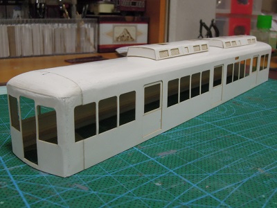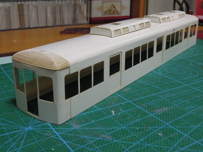 | 1958車体組 ・雨樋、ウインドシル、ドア靴ヅリを取り付けた状態。 |