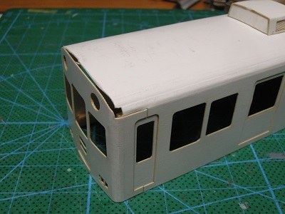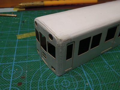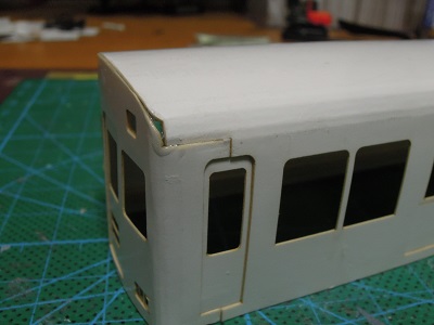 | 1913車体組 ・問題の前面と屋根の接合部の隙間は、裏からエポキシを 盛り、角を削っていきます。 |