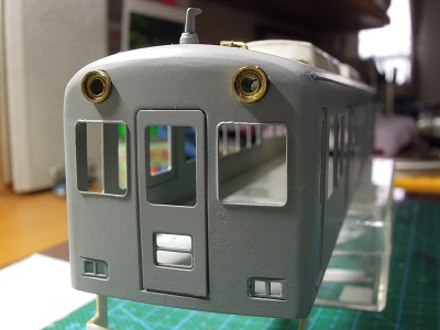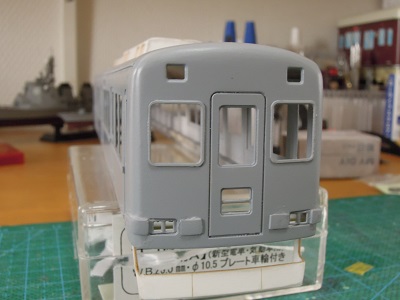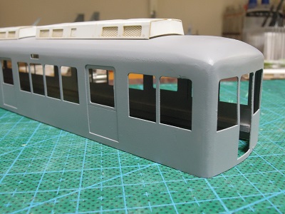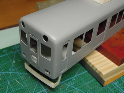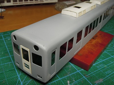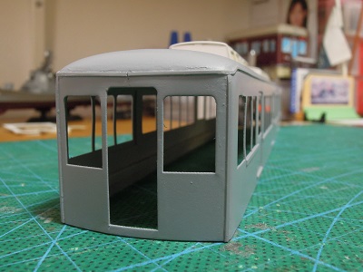 | 1913車体組 ・表面処理として、#500のサフェ吹き→削り→サフェ吹きを 繰り返していきます。 写真派は仕上げの#1000のサフェを吹いた状態。 加えて前面貫通ドアを仮止めしてみました。 |