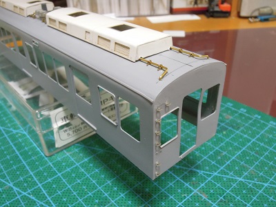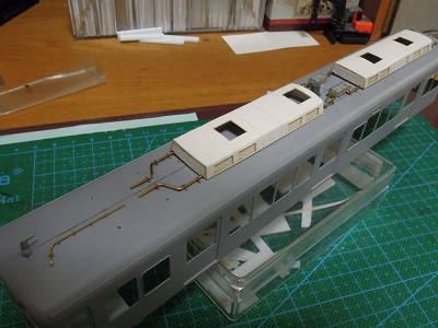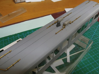 | 1913F車体組立 ・クーラーキセにΦ0.3mmの真鍮線で手摺を取付けます。 |