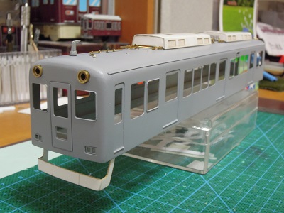 | 1913車体組 ・車体に最終仕上げのサフェを吹き、屋根上配管に着手 します。 鉄コレを参考に、Φ0.6mm、Φ0.4mmの真鍮線を用いて 配管を再現します。 「HIRODEN〜京阪電車の鉄道模型のページ〜」管理人 より情報を頂きました。 この場を借りてお礼を申し上げます。 |