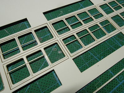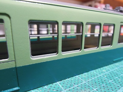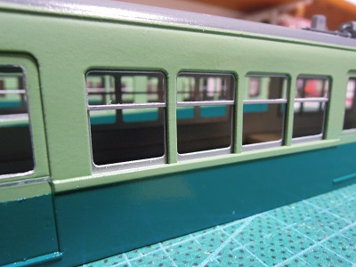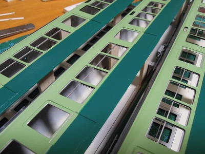 | 1913F車体組立 ・先に塗装しておいた窓サッシを貼り付けます。 |