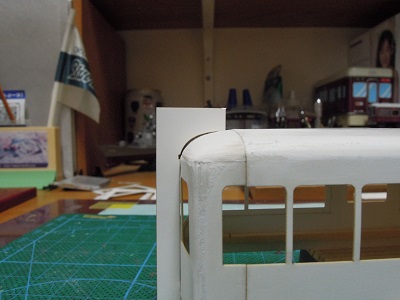 | 1997車体組 ・旧運転台側の前面Rを付けていきます。 こちらもテンプレートに併せて、角Rと前面Rを調整して いきます。 |