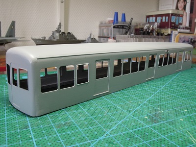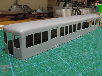 | 1914車体組 ・平滑処理などを経て、仕上げのサフェ#1000を吹いた 状態。 |