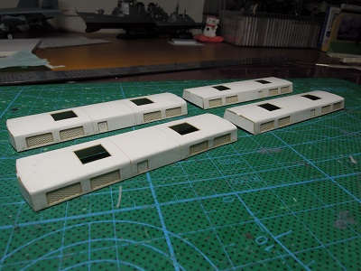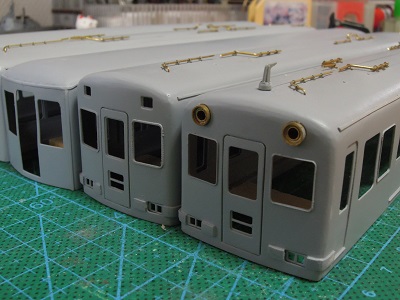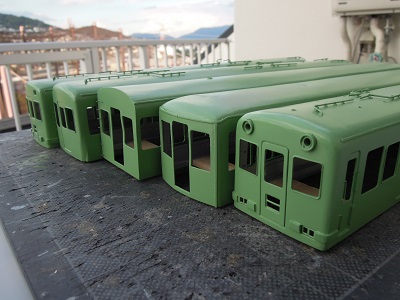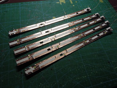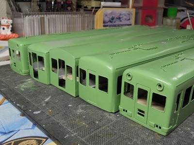 | 1913F車体組 ・編成5両の車体組完了です。 これから配管類を実装していきます。 しかし編成5両全てタイプが異なるのは困ったものです(^^; |