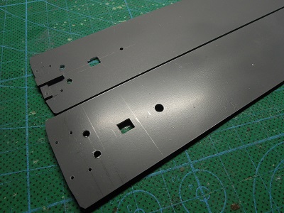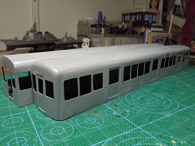 | 1958、1985車体組 ・平滑処理などを経て、仕上げのサフェ#1000を吹いた 状態。 |