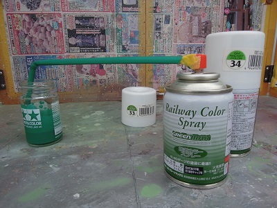 | 1913F車体塗装 ・下半分もGMの缶スプレー(GM33:京阪ダークグリーン)を 使用します。 同様に塗料抽出します。 |