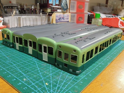 | 1913車体組 ・屋根上からの俯瞰 奥の車両は気にしないでください(^^; |