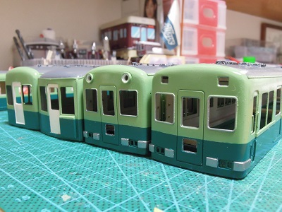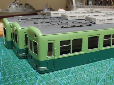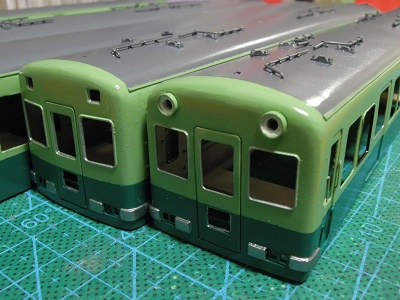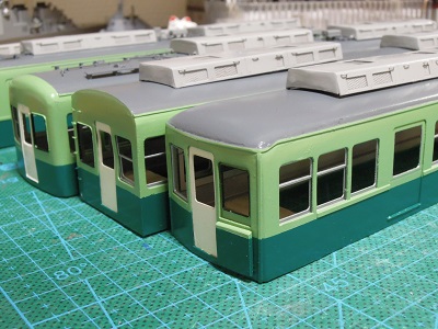 | 1913F車体組立 ・クーラキセはGM8:ねずみ1号に白を加えて明るめにし、屋根と メリハリが出るようにしました。 |