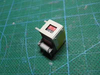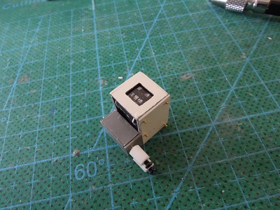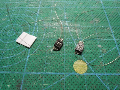 | 1913F床下組立 ・写真の1.27mmピッチ2ビットDIPスイッチが手に入ったので、 通過標識灯を左右個別にON/OFFできるようにします。 DIPスイッチをシール基板に実装し、接続は目立たない様に ポリウレタン線を用いています。 |