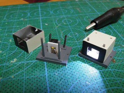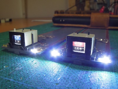 | 1913F照明類作成 ・側面方向幕用のライトユニットはプラ板で作った台座に LED接着したもので、これを車体側に接着します。 制限抵抗は上の写真の室内灯紙基板に設けています。 ここまでの作業期間:2022/8/28〜2022/9/26 |