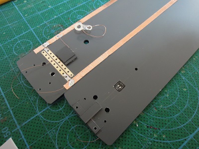 | 1913F床下組立 ・電気配線はコードが煩わしいので、出来る限り最小と するため銅テープを多用しました。 |