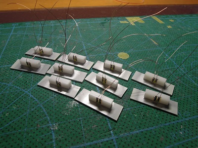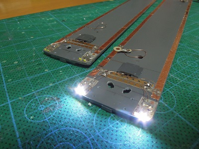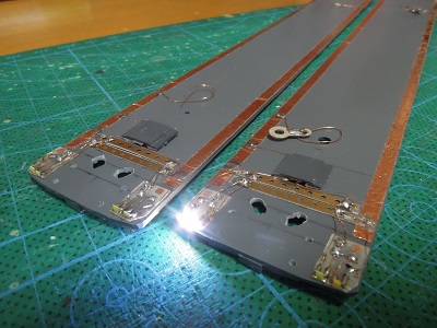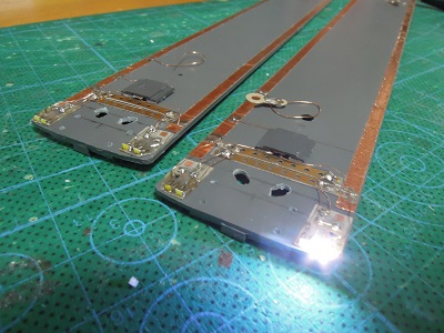 | 1913F照明類作成 ・照明は自作の紙基板です。 厚紙に銅テープを貼って回路を形成します。 照明用LEDは4個/両としています。 |
