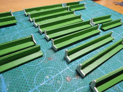 | 1913F室内組立 ・ロングシートはKTM製のプラロングシートの入手性が 悪いこともあり、厚紙で自作しました。 ”ト”の字型に接着したシートの両端に、仕切を接着し、 それらしく表現しています。 |