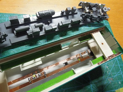 | 1913F床下組立 ・出来るだけ配線を少なくしたいため、通電は銅テープを多用 することにしました。(^^; |