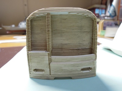 ・車体箱組(2022/1/3) 前面からの俯瞰。 積層パーツと側面との継ぎ目が目立たなく無くなる様に 平滑処理を行います。 |