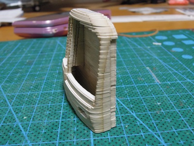 ・前面部組立(2021/9/29) 41枚目から50枚目を積層して接着材を流した状態。 だいぶと顔が現れてきました。 |
