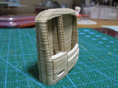 ・前面部組立(2021/9/21) 112枚のパーツを切出し、順次積層していきます。 型紙の設けたΦ1mm位置決め用ガイド穴にΦ1mmの プラ棒を挿してガイドとし、10枚づつ重ねては接着を 繰返します。 接着剤は、低粘度の瞬間接着剤を用いています。 写真は10枚積層段階。 |