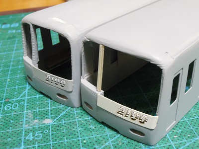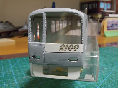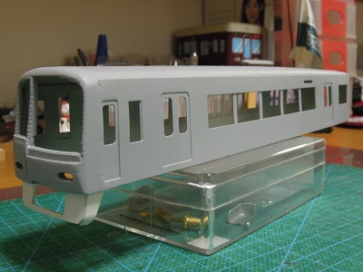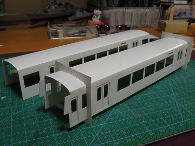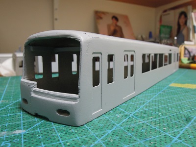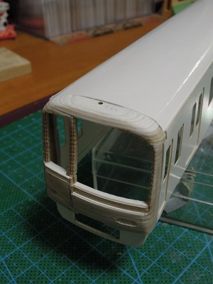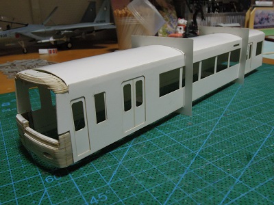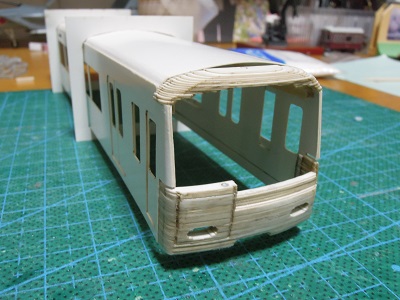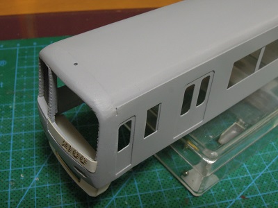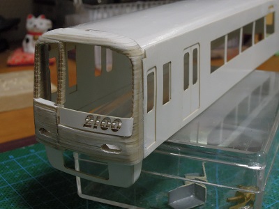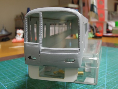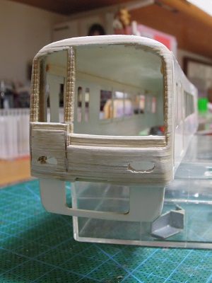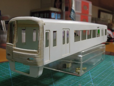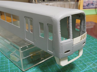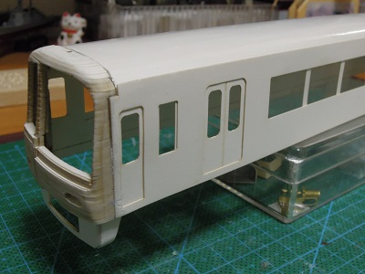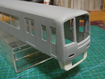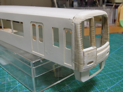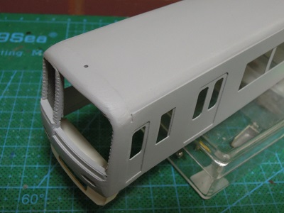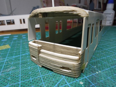・車体箱組(2022/1/13) 先頭車も同様に。 前面との接合部を重点的に平滑化していきます。 |