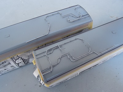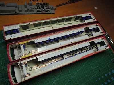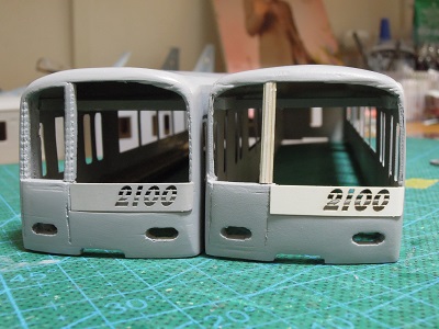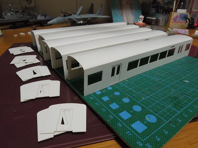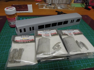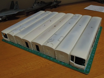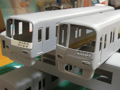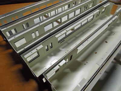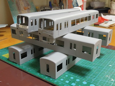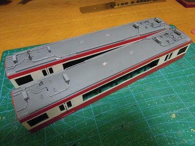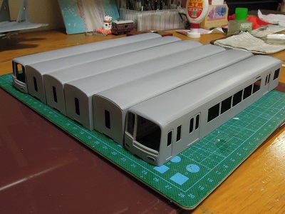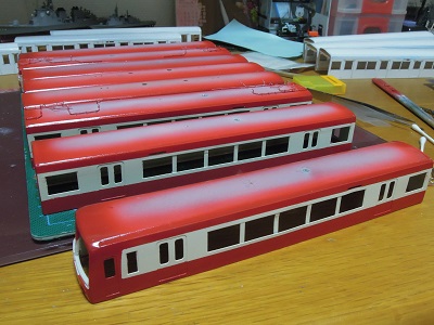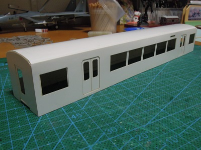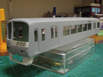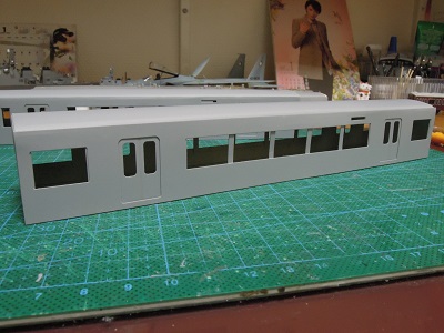 ・車体箱組(2022/1/13) サフェを吹いて下地処理に。 写真は中間車。 |
