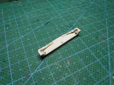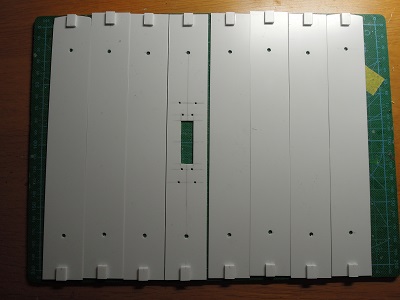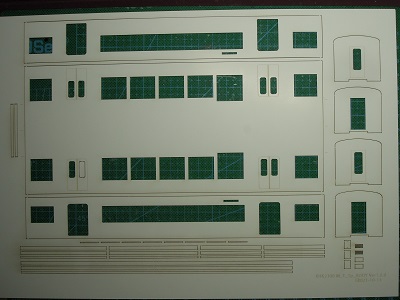 ・車体塗装(2022/9/11) 型紙とKTMのキットでは客間度の構造が異なります。 型紙では車体補強と窓セルの糊しろとして、縦桟を 設けています。 |