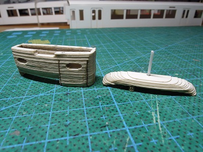 ・車体箱組(2022/4/29) 先頭形状、フル積層(右)、部分積層(左)いずれの方法でも 何とかなりそうですが、手間を考えると、部分積層の方が 良いかと考えます。 |