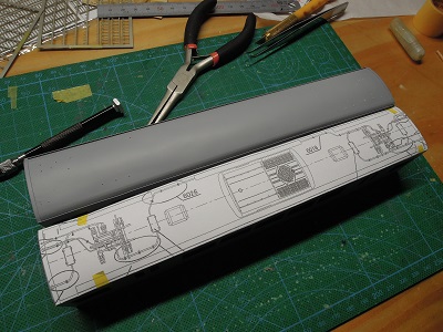 ・車体箱組(2021/12/27) まずは車体組。 テンプレートで曲げのガイドラインとします。 |