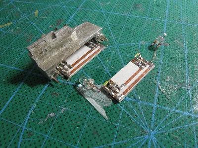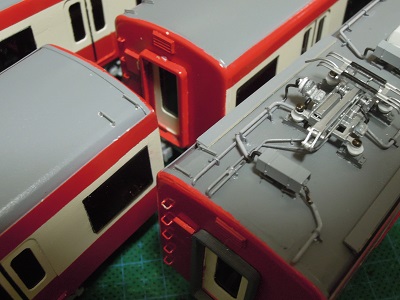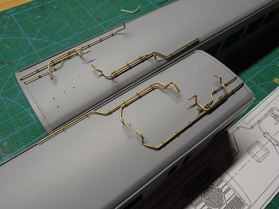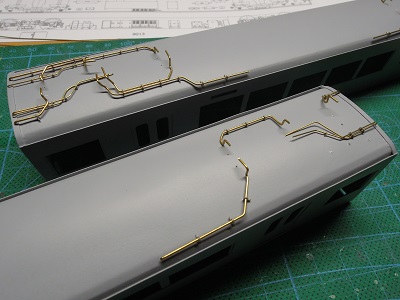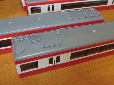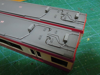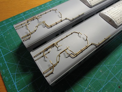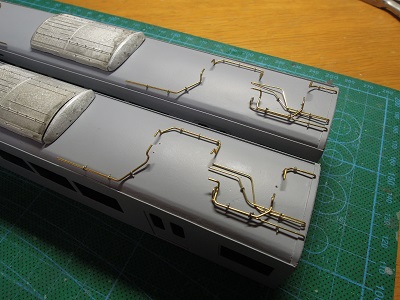 ・車体箱組(2022/7/18) 三崎口寄りパンタ周辺の配管。 縦2段の配管が面倒です。 |